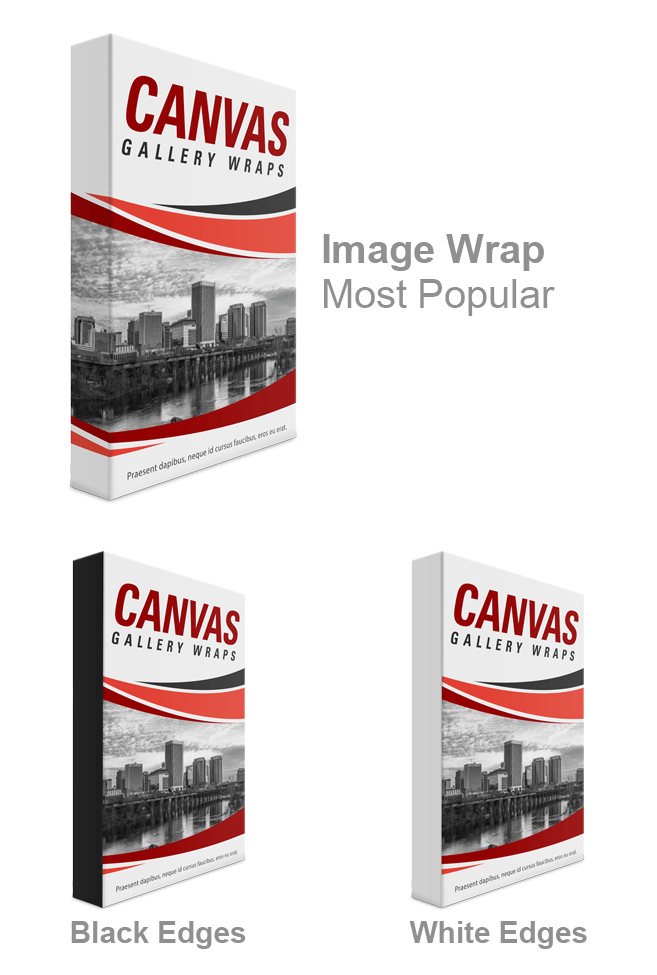 Affordable, museum-quality canvas gallery wraps are a timeless and versatile method of displaying photos and art prints. They look just as great in the lobby of your business as they do on the wall in your living room. Our high quality canvas prints stretched over deluxe 1.5″ deep frames made from CNC precision cut wood. Canvas gallery wraps are great as individual prints or multi-panel collages. For the edges, chose from an image wrap (our most popular option) or solid color black or white.