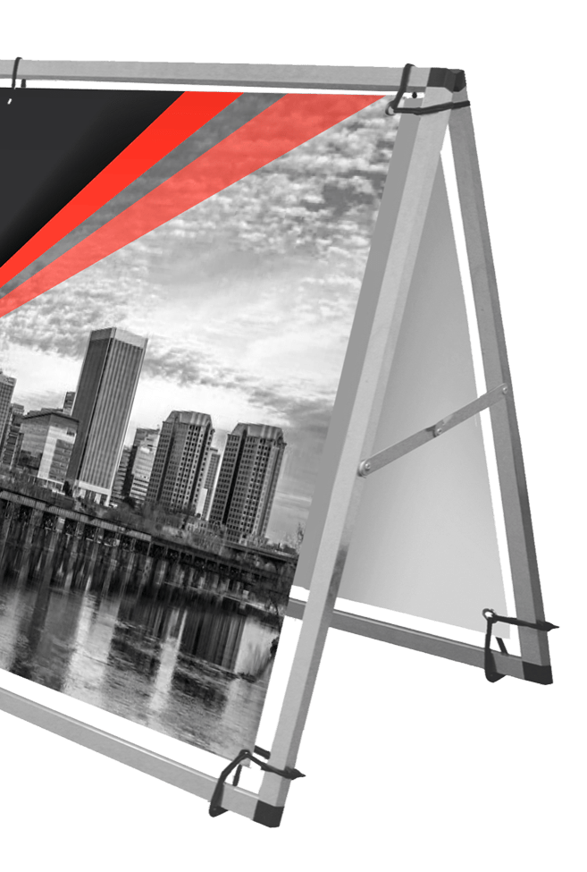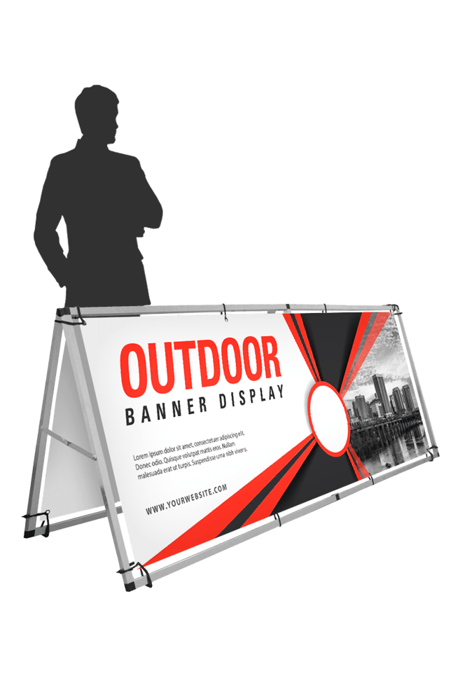 Our Outdoor Banner Display features an ‘A’ frame made from lightweight 1″ square aluminum tubing and reinforced plastic moldings. Includes two 92″ x 32″ banners with your custom graphics. This display is very easy to use, reusable and is the perfect graphics carrier for venues, events, exhibitions, promotions and indoor or outdoor shows.